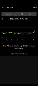 My results are below. VO2 Max has improved in the last six months steadily and is now at 43. I am somewhere in the 80th-85th percentile now, up from the 50th-55th percentile in October 2023. A good improvement.